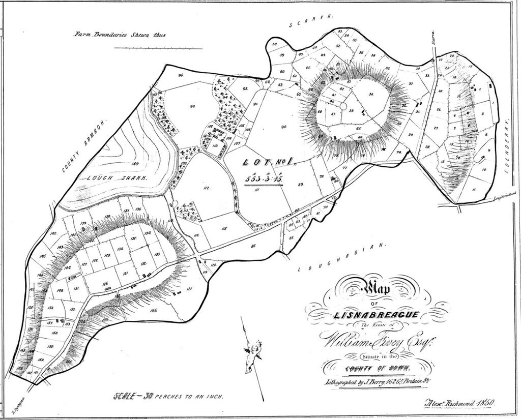 In 1850, he produced the maps in the documents pertaining to the sale of William Fivey’s estate (Lisnabrague and Edenderry) by The Commissioners For The Sale of Encumbered Estates. In the latter months of this sale process, the name of David Richmond, his oldest son, also appeared in the ‘for sale’ adverts. “CE” (Civil Engineer) is appended to both names in 1853. Alexander’s name also appears as the surveyor in adverts in 1858 for the procurement of “several thousand tons of stones” for the repair of the road from Newry to Charlemont.