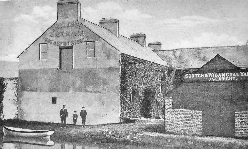 Its main original use was as canal-side warehouses and a maltings. It had many uses since then, some of them concurrent – pub, hotel, warehousing, draper’s shop, hardware and grocery store, etc. In Victorian and Edwardian times, part of it was The Railway Hotel[2].