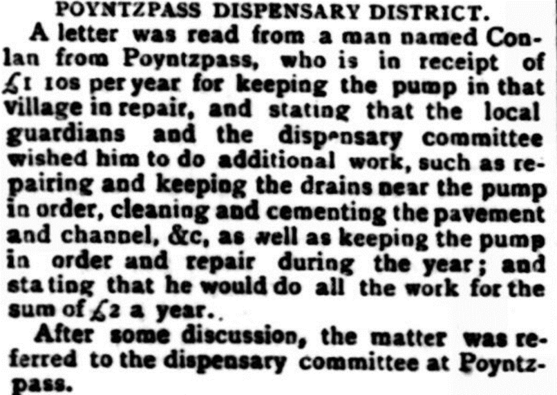 “…the inhabitants of Poyntzpass were delighted that a pure water supply had been provided [but]…as the times were very bad the inhabitants of the village were not willing to go to the expense of taking water into their private houses”.