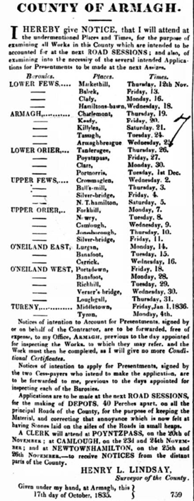 A few weeks after Lindsay’s 1837 ‘tour’, a special local Road Sessions was held in the principal town of each barony, such as Tandragee for Lower Orier and Markethill for Lower Fews. They considered a large variety of matters; the words are taken almost verbatim from the 1836 Act: