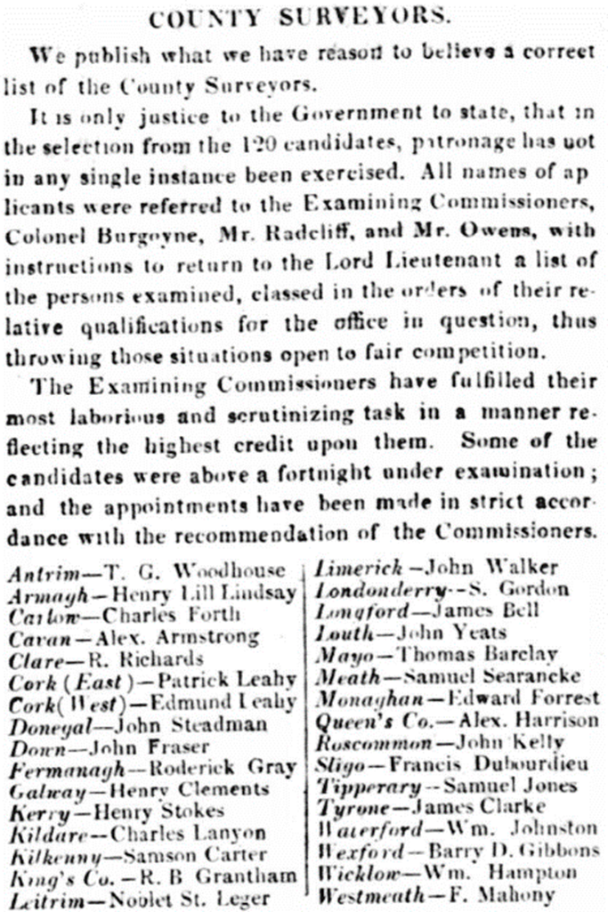 [4] Final confirmation of all 32 county surveyors was published at the same time. A full list of names appeared in the Dublin Morning Register on 23rd May 1834.
