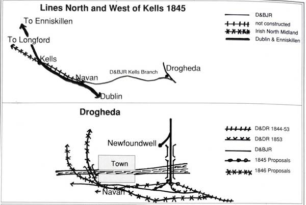 This request was made at the end of January 1846. Within ten days negotiations were under way. The D&DR refused to rent the line, but initially promised to lease it if the Junction extended it to Kells, the rent to be lower if the Dublin & Enniskillen ever succeeded in building its line. The talks stalemated until May when Drogheda Corporation demanded a pledge that work would begin promptly on the Navan line before they would cooperate in providing a site for a station at Newfoundwell. This was a serious matter as the temporary station there would be at the side of the line, where the company had no rights of compulsory purchase.