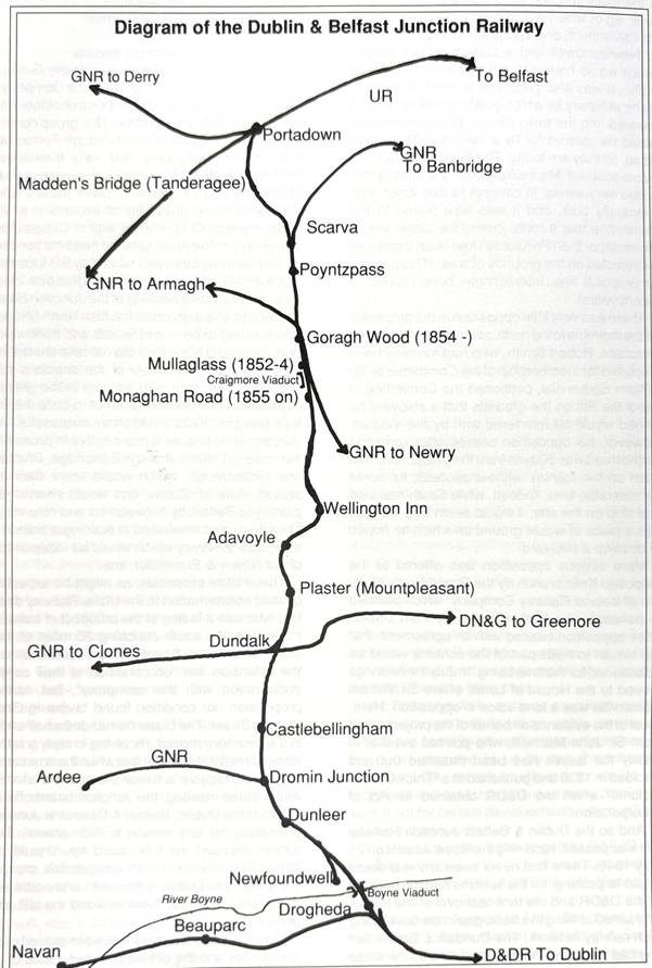 The title of the Dublin & Belfast Junction Railway seems to fascinate many people who point out that in actual fact, the Company’s line never joined the two towns mentioned. Yet, the title is truly descriptive of the Company’s purpose. It was a JUNCTION railway, a gap filler whose construction made possible a through rail route between Belfast and Dublin. In its day, it was commonly referred to as the “Junction” Railway, just as its close relative, the Dublin & Drogheda, was commonly called the “Drogheda” company, and I will use both these titles throughout these papers.