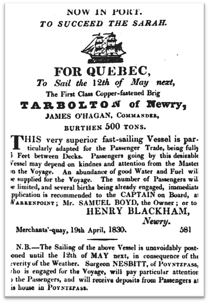 Dr Nesbitt sailed from Warrenpoint for Quebec on 12th May 1830, on board the brig ‘Tarbolton’ and was ship’s doctor during the voyage. If you thought you might want to avail yourself of his medical skills during the voyage, you had to pay a visit to his house in Poyntzpass and pay your deposit.