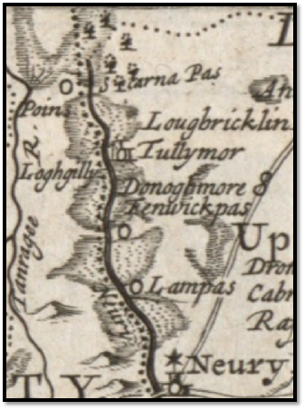 The pass is labelled, but neither as Poyntz’s or Fenwick’s – something like Fraghernag (the first two letters are indistinct). It may just be a contemporary spelling of Federnagh, the townland in which it lies. If so, this would emphasise that the location was unimportant other than as a route across the bog. The map gives no clues as to the physical nature of the crossing, although as we saw earlier, there was a wooden bridge there by 1660.