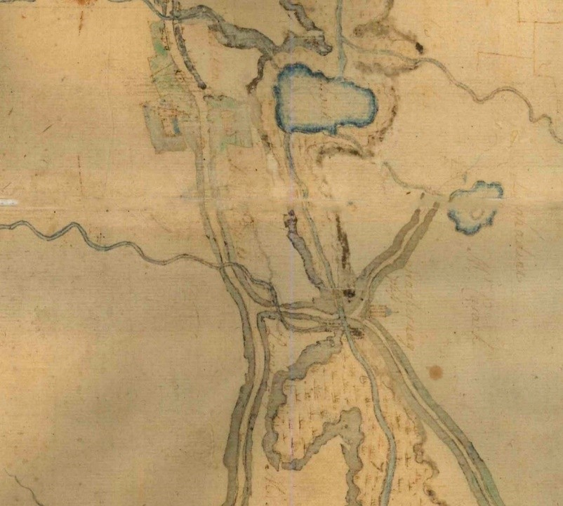 - The small river through the village is shown crossing what is now Railway Street and entering the bog downstream of the crossing, rather than upstream.