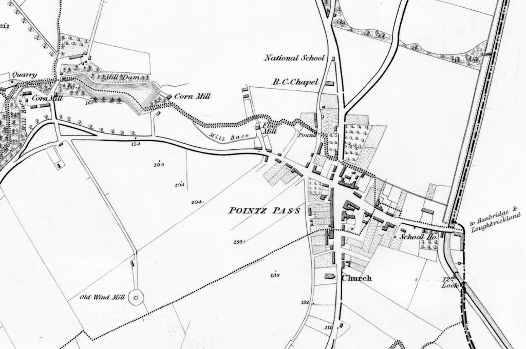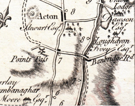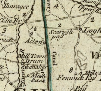 Although the name Points Pass now appears in a more ‘correct’ location, Acton is written in a font that indicates a more significant settlement. Typographically at least, ‘Points Pass’ is depicted as being on a par with Loughadian. The map also seems to show a road (and presumably bridge) of which no trace exists today, crossing the canal immediately north of Lough Shark, leading to Union Lodge.