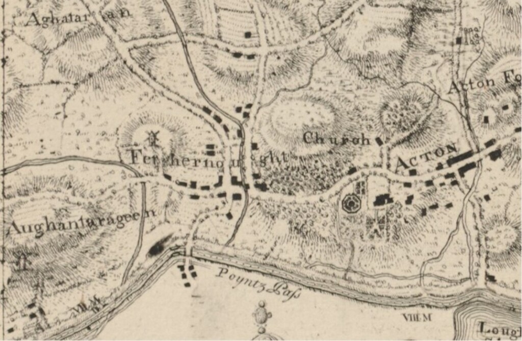 The words “Poyntz Pass” appear on the other side of the canal, in Co Down, which Rocque was not mapping, and seem to be the name of the pass through the bog rather than being the village name. The name of the townland, Fenhernought (Fedrenagh) is much more prominent, and the name Acton is even more prominent.