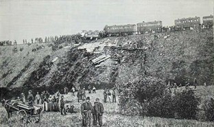 The 2.30pm southbound train from Portadown left the tracks suddenly after travelling about two miles, probably due to the track having bucked in the heat. Four carriages fell on their sides; five people were killed and about 25 gravely injured.
