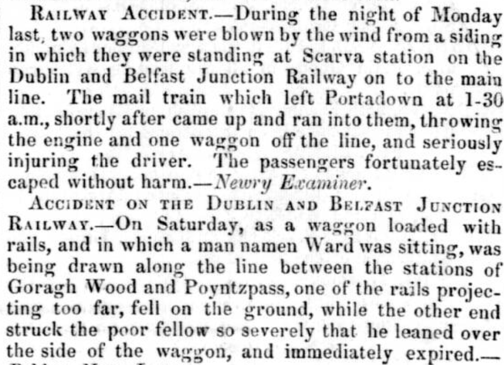“It appears that a railway porter, named Samuel Henry, was walking from Scarva station to that of Poyntzpass. On the line, which he considered the shortest way to accomplish the journey, he was met half way by the express night mail from Dublin, and knocked down, the whole train passing over him. He was, of course, instantly killed.”
