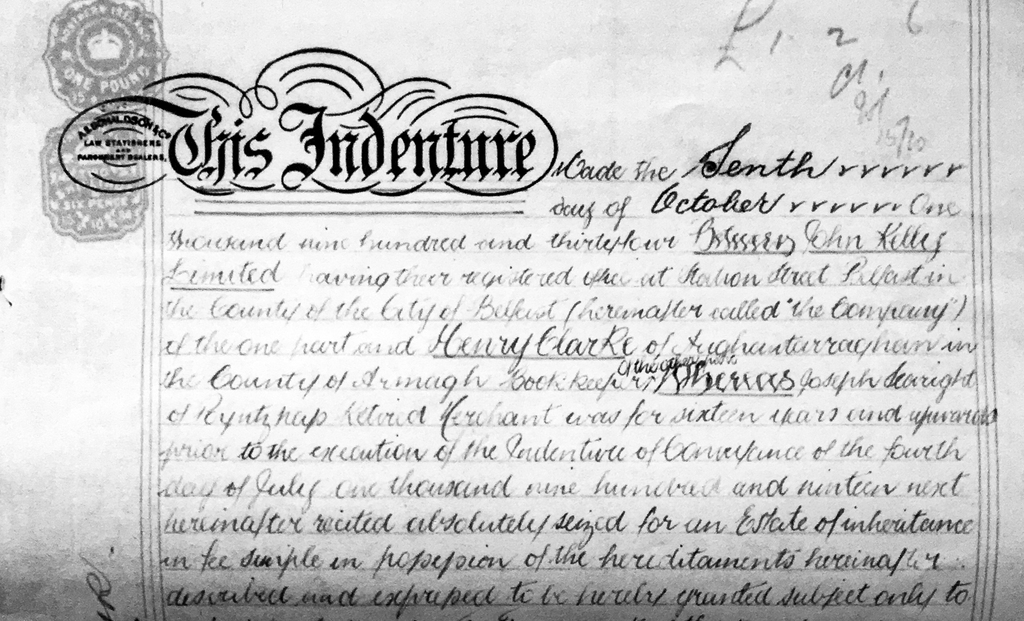 When Hugh was doing his research at the Public Records Office of Northern Ireland (PRONI) for his lecture “A Fatal Affair in The Far Pass”, he found a copy of the conveyance documenting the 1934 purchase by my father, Henry Clarke, of the property once known as The Railway Hotel or The Malt Kiln.